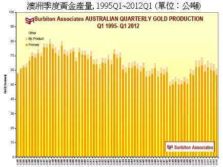 道瓊斯通訊社報導,澳大利亞研究機構瑟比頓聯合公司(Surbiton Associates Pty. Ltd.)6月24日公佈報告表示,2012年第一季澳洲黃金產量連續第三個季度下降成為62公噸,較前季以及去年同期分別減少5%與4%,主要受到潮濕天氣的影響。