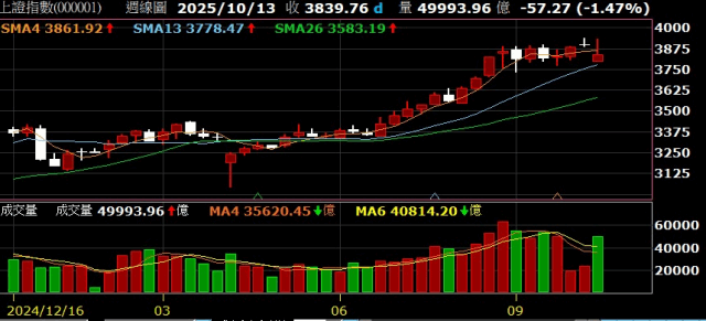 以週線來看,上證指數本週跌1.47%(附圖),惟週K翻紅;深證成指跌4.99%、創業板指跌5.71%、科創50跌6.16%、中證A500跌3.31%,週K均連2黑。