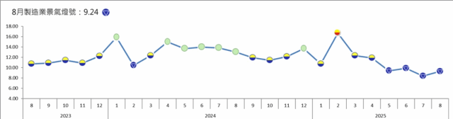 在國內方面,台經院指出,受惠AI科技應用需求續強、消費性電子新品備貨旺季,以及8月台幣兌美元相較去年同期升幅較7月明顯縮小,8月出口、外銷訂單與生產指數年增率續為雙位數成長,惟增幅較7月收斂,主要原因係傳統產業受市場低迷與客戶下單保守影響持續減產,抵銷部分科技業成長動能,拖累原物料投入與成本等面向指標表現。股市方面,由於美國釋出赴美投資的半導體企業關稅可望豁免消息,激勵台股價量齊揚;同時製造業廠商看好當月景氣的比例較7月調查時增加、看壞比例下降,推升經營環境面指標。整體而言,製造業景氣信號值由今年7月調整後的8.36分,上升0.88分至8月的9.24分,燈號仍為代表景氣衰退的藍燈。