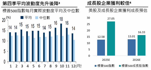 根據統計,10月通常股市面臨較大波動3,但11月及12月平均波動將減緩。隨著美中緊張關係逐漸緩解,加上投資人預期政府停擺將結束,且各大企業財報陸續公布,市場將把焦點轉向企業基本面。根據預估,標普500指數2026年企業獲利將成長13%,成長股則為成長16%表現更佳4。