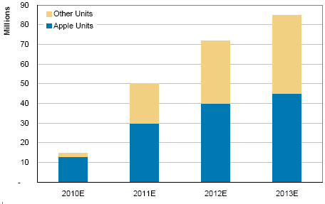 而蘋果所帶動的平板電腦需求不僅僅是iPad,也帶動了其他作業系統的平板電腦,如以Android為作業系統的平板電腦;根據Morgan Stanley券商預估,平板電腦出貨量將由2010年的1500萬台成長,到2013年出貨量將達8500萬台,年複合成長率高達78%。