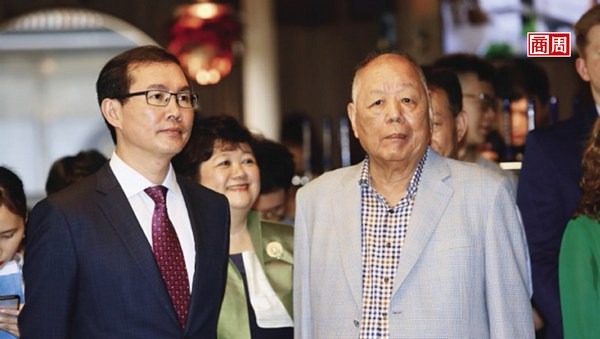 高齡81歲的金車創辦人李添財(右),罕見與兒子李玉鼎(左)合體出 席金車燒肉店開幕,從他坐鎮全場,不難看出對這次轉型的重視。(攝影者.駱裕隆)