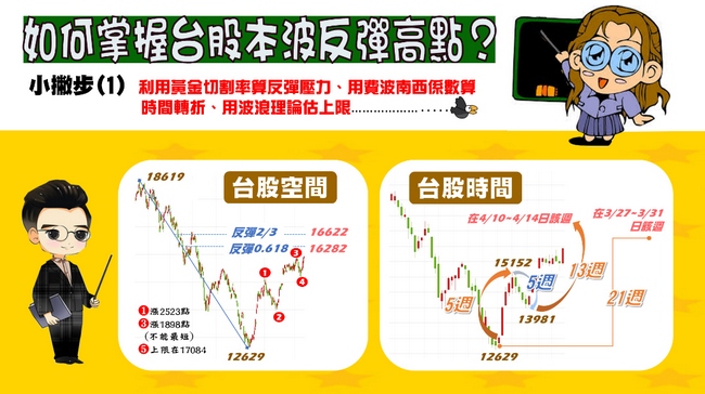 再從時間波來計算,3/27~3/31為12629上漲以來第21週,確實已出現15951反彈以來高點,只是距離前述的16282及16622,仍有一定差距。故15951若不是高點,要看接下來4/10~4/14該週為13981上漲以來第13週,也是做為高轉低的參考依據。