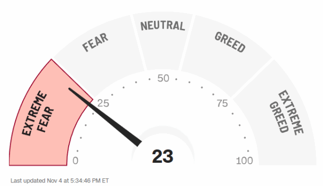 CNN恐懼貪婪指數(CNN Fear & Greed Index)顯示,11月4日美股投資人的態度為「極恐懼」、指標下降至23點,遠低於3日的44點、當天投資人態度為「恐懼」。