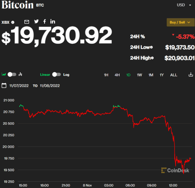 上述消息衝擊SOL、FTT重挫,拋售潮蔓延至比特幣。CoinDesk報價顯示,截至台北時間8日下午2時24分,比特幣報19,753.17美元、較24小時前下殺5.30%;SOL報26.50美元、較24小時前大跌17.77%;FTT報16.06美元、較24小時前大跌27.39%。
