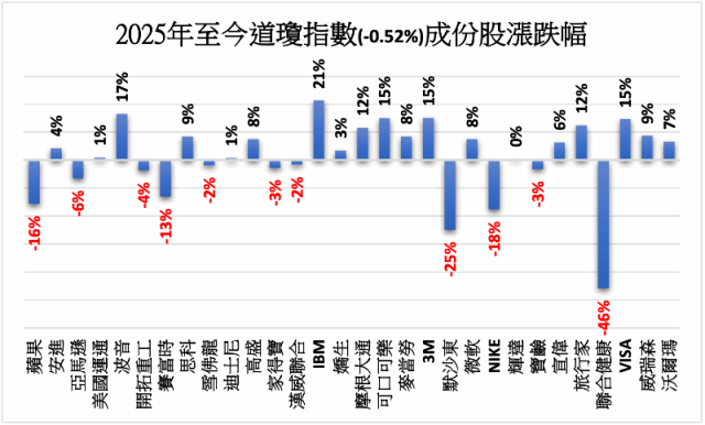 道瓊指數前5大權重股當中,高盛(權重8.94%)上漲0.70%,微軟(權重6.62%)上漲0.23%,家得寶(權重5.45%)上漲1.56%,Visa Inc.(權重5.21%)上漲1.64%,宣偉(權重5.14%)上漲2.87%。