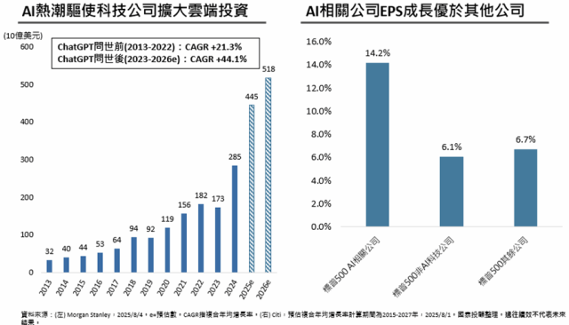在企業表現方面,法人指出,第二季財報顯示全球科技公司持續加大雲端資本支出,並表明2026年AI投資力度不減,市場調升2025年、2026年雲端資本支出至4,450億美元、5,180億美元,這是自ChatGPT問世起連續3年對AI的擴大投資;其中,雲端投資複合年增長為44.1%,為過去10年的2倍之多,顯見AI需求強勁,而AI投資當中又以美國最為積極,超逾90%投資科技公司來自美國。