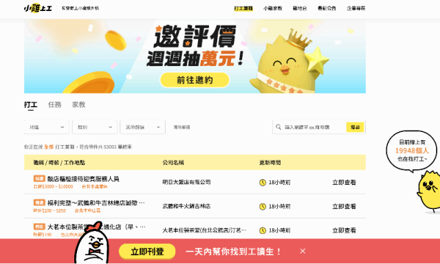 近年來基本工資持續上漲,加上兼職工作的時間較為彈性,因此小雞上工求職者數量持續增加,職缺數量則維持穩定,目前求職者仍以大學生為大宗,不過30-50歲年齡層的求職者成長速度也非常快。