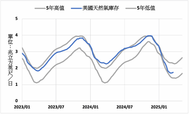 3月20日至3月26日當週,美國天然氣日消費量較前週增加4.1%至779億立方英尺。其中發電部門的天然氣日消費量較前週增加0.3%至277億立方英尺,工業消費量較前週增加1.0%至237億立方英尺,商業/住宅的天然氣消費量較前週增加11.7%至265億立方英尺。報告表示,2024/2025冬季美國天然氣提取率比五年平均值高出25%,預估至本季結束3月31日的總庫存將為1.636兆立方英尺,比五年平均值1.860兆立方英尺低了2,240億立方英尺。