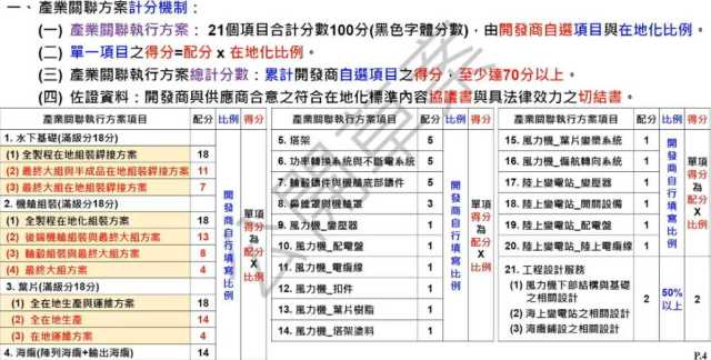 MoneyDJ新聞 2023-09-28 09:41:04 記者 鄭盈芷 報導 經濟部能源署昨(27)日舉辦離岸風電草案3-2說明會,產業關聯方案(國產化)將調整為總分制,分數須達70分以上,開放由開發商自選項目及數量,越多製程國產化以及國產化愈高,實際得分會愈高,而先前必做項目在本次配分也最高。