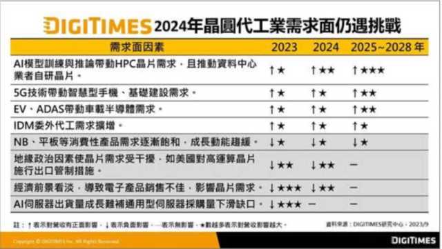 DIGITIMES分析師陳澤嘉表示,今(2023)年半導體景氣不佳使全球晶圓代工產業營收下滑至1,215億美元,減少13.8%;展望2024年,雖營收可望反彈,然總經成長動能不強及地緣政治風險是抑制產業成長動能的二大主因。晶圓代工業雖在短期面臨逆風,但HPC應用相關晶片需求仍強,5G、電動車(EV)等晶片用量提升也為晶圓代工業提供支撐,加上晶片自研風潮,以及IDM委外下單趨勢不變,而新產能也持續開出以因應產業需要,中長期晶圓代工營收成長仍可期。