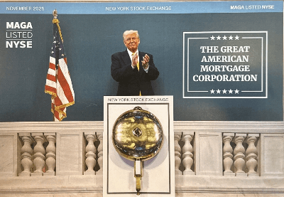 川普於9日在Truth Social平台上發佈一張AI生成圖,顯示他本人在紐約證券交易所敲響開市鐘,圖片左方寫著「MAGA於紐約證交所上市」,左上方背景時間為「2025年11月」,右方則顯示「偉大的美國抵押貸款公司」。
