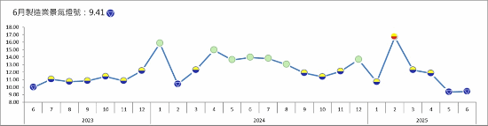 在國內方面,台經院指出,受惠於人工智慧、高效能運算與雲端服務應用需求強勁,外銷訂單年增幅持續擴大,然而,傳統產業則受到貿易保護主義升溫、新台幣較上年同期大幅升值及同業低價競爭等不利因素影響,部分抵銷出口與生產指數增幅,拖累原物料投入與售價等面向指標表現。在股市方面,受到中東緊張情勢緩和及美國科技股上漲,國內股市呈現價量齊揚,帶動經營環境面指標改善。綜合而言,6月製造業景氣信號值為9.41分,較5月修正後之9.34分增加0.07分,燈號續呈代表景氣衰退的藍燈。