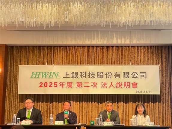 上銀(2049)今(11)日召開實體法說會,上銀董事長卓文恒(附圖左二)表示,明(2026)年目標是要比2025年成長,在動能方面,2026年半導體相關產品的產能計畫持續擴充,包括晶圓機器人、晶圓移載平台在2026年需求都還持續,而上銀在中國以中高階設備應用為主,需求都還維持,目前看大型基礎建設設備需求有增溫,至於美國則看好製造業回流,2026年市場也可望成長;另外,上銀與美國機器人廠Dexterity合作的AI物流專用機器人目前測試順利,預計客戶2026年會下小批量訂單,並進一步在物流廠做小批量測試,屆時會有好幾十台在生產線上運作,會比2025年測試量稍微增加,若物流廠小批量測試沒問題,將可望進入大規模測試階段,看好2~3年AI專用型機器人陸續應用在各產業。