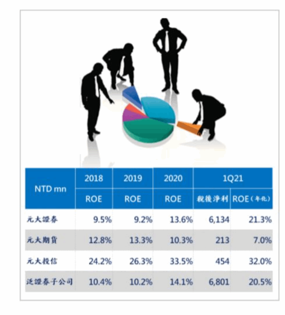 MoneyDJ新聞 2021-06-03 11:37:37 記者 邱建齊 報導 受惠台股今年以來的強勢表現,元大金(2885)前4月歸屬母公司淨利132.18億元、年增1.1倍,稅後EPS 1.09元較去(2020)年同期的0.54元有翻倍表現;第一季年化股東權益報酬率(ROE)已由去年同期的7.1%與前一季的9.9%大幅上升至14.6%,尤其元大證券由去年的13.6%再度大幅攀升至21.3%,雖然元大期貨由10.3%降至7.0%、元大投信也由33.5%降至32.0%,但整體泛證券子公司仍由14.1%勁揚至20.5%(見圖,元大金法說資料)。