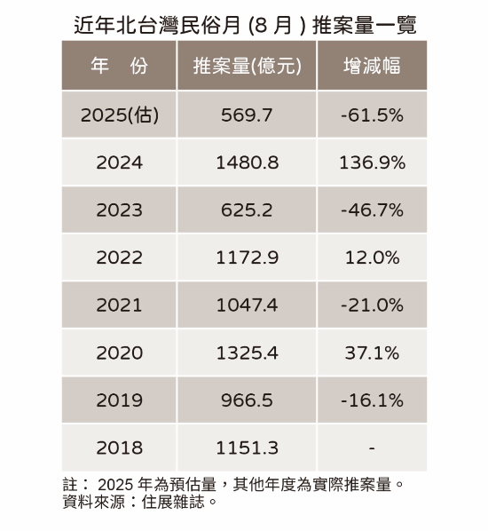 MoneyDJ新聞 2025-08-07 11:45:12 記者 新聞中心 報導 房市調研機構住展雜誌今(7)日表示,華人傳統的民俗月多在8月登場,今(2025)年雖逢閏月,但也在8月底進入鬼月,出於入厝的顧忌遠勝於購屋,加上隨著時代變遷,沖淡不少習俗包袱;觀察近年8月北台灣推案量,自2018年起多有來到千億元以上量能,去(2024)年的房市熱潮甚至逼近1500億元的紀錄新高,然而,今年房市利空烏雲不散,鬼門開之際新案更不敢開,推估的公開案量破不了千億元不說,驟降至569.7億元,年減61.5%,創近8年來新低,比禁止預售任意轉讓的平均地權條例修法上路時期,以及疫情三級警戒的時候都來的差。