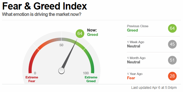 另一方面,CNN編制的「恐懼與貪婪指數」(Fear & Greed Index)目前雖由「中立」轉進「貪婪」,但尚未進入「極度貪婪」的象限。(見圖)