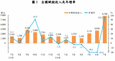 財政部統計7月實徵淨額8768億元,年增3.1倍,其中以營利事業所得稅增加3,446億元、綜合所得稅增加3230億元較多,印花稅創下歷史新高,營所稅、綜所稅、遺產稅、營業稅、房屋稅及娛樂稅創歷年同月新高。累計1至7月實徵淨額2兆3021億元,年減2.1%,其中以證交稅減少352億元、營所稅減少241億元及貨物稅減少124億元較多,惟綜所稅增加314億元,綜所稅、房屋稅、牌照稅、印花稅、娛樂稅創同期新高。