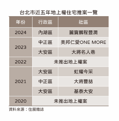 高房價限制民眾居住權益,內政部研議推出權利金取代買賣價格的使用權住宅,而觀察同樣沒有土地所有權的地上權住宅,以台北市為最主要推案地,不過近五年來台北市除了於2021年推出3案相對為多,2020、2022年則是一個地上權案都沒有,2023年有兩案,2024年僅1案,市場對這類產品興致相當淡薄。