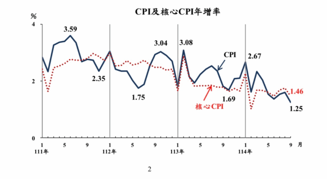 主計總處進一步指出,9月CPI較上年同月上漲1.25%,原因是近期毛豬供量減少,推升肉類價格漲勢,同時蔬菜、蛋類及外食費等食物類價格亦上漲,加上房租、家庭管理費用、補習及學習費、交通工具零件及維修費等費用調升,與臺鐵票價調漲,惟交通工具因新購汽機車貨物稅減徵與廠商促銷而價跌、機票下跌及油料費仍處低檔,抵銷部分漲幅的交互影響所致;若扣除蔬菜水果則上漲1.23%,再剔除能源後之總指數、即核心CPI為上漲1.46%。