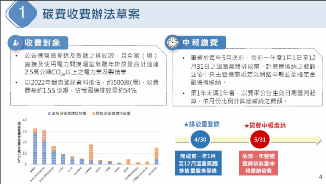 其中,在「碳費收費辦法」草案方面,收費對象為符合「事業應盤查登錄及查驗溫室氣體排放量之排放源」、且其全廠(場)之直接排放及使用電力之間接排放產生溫室氣體年排放量,合計值達2.5萬公噸二氧化碳當量以上的電力業及製造業,以2022年盤查登錄資料推估,約500廠(場),佔我國總排放量約54%,包含鋼鐵、水泥等產業都將列入其中。另外,考慮同一行業內公平競爭因素,事業於計算收費排放量時,原則可扣除起徵門檻2.5萬公噸二氧化碳當量。