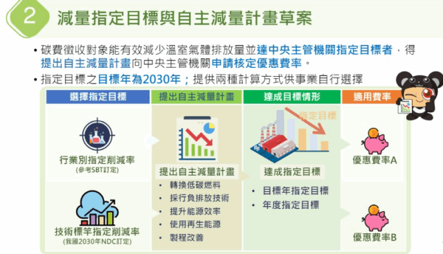 在「碳費徵收對象溫室氣體減量指定目標」草案及「自主減量計畫管理辦法」草案方面,依據氣候法第29條規定,碳費收費對象因轉換低碳燃料、採行負排放技術、提升能源效率、使用再生能源或製程改善等溫室氣體減量措施,能有效減少溫室氣體排放量並達中央主管機關「指定目標」者,可提出「自主減量計畫」申請核定「優惠費率」。本次預告草案是以達成2030年減量目標進行規劃。