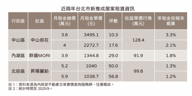 房市研調機構住展雜誌今(2)日統計租賃時價登錄資料指出,台北市近兩年推出的新成屋出租資訊,共僅三社區有實登紀錄,顯出租屋市場的不透明,而租金方面,北市新房子月租金則由三萬起跳;根據實登資料,中山區市中心小宅案「中山自在」兩筆租件的月租金單坪各來到3498.5元與2279.2元,僅10多坪空間的總租金達三、四萬元。同時,台北市新成屋的高房價一定程度稀釋了出租投報率,如「中山自在」雖有租賃優勢,平均每坪128.4萬元的交易價碼,要是僅租到單坪兩千多元則只有2%的投報率,追趕不上走高的房貸利率。