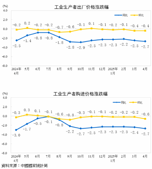 中國國家統計局於上週六(10日)公布,今(2025)年4月全國工業生產者出廠價格(PPI)年減2.7%,降幅較上月擴大0.2個百分點,創近六個月以來最大跌幅;工業生產者購進價格年減2.7%。累計1-4月平均工業生產者出廠價格和購進價格較去年同期均下降2.4%。