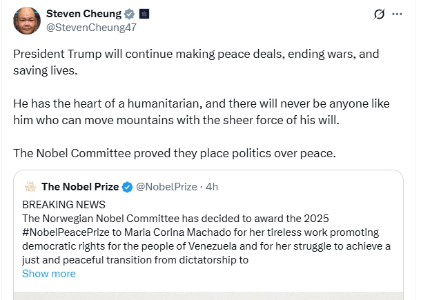 今年度諾貝爾和平獎由委內瑞拉反對派政治家瑪麗亞·科里納·馬查多(Maria Corina Machado)獲得,對此美國白宮現任通訊主任史蒂芬(Steven Cheung)直接開罵諾貝爾委員會,「政治置於和平之上」。 諾貝爾和平獎由委內瑞拉政治家獲得。圖/翻攝自諾貝爾委員會@X白宮現任通訊主任史蒂芬在X上轉發此次諾貝爾和平獎的得獎發文,指出川普總統將繼續促成和平協議,結束戰爭,拯救生命,「他擁有一顆人道主義者的心,再也沒有人能像他一樣,憑藉著意志力移山倒海。諾貝爾委員會證明了他們把政治放在和平之上。」 白宮現任通訊主任痛批諾貝爾委員會。圖/翻攝自X瑪麗亞·科里納·馬查多是委內瑞拉民主運動的領袖,從20多年前就積極爭取自由公正的選舉,也一直為司法獨立、人權和民眾代表權發聲。諾貝爾委員會表彰她為委內瑞拉人民爭取民主權利所做的不懈努力,以及為實現從獨裁到民主的公正和平過渡所做的鬥爭。 責任編輯/陳俊宇 (本文由 台視新聞 授權轉載)
