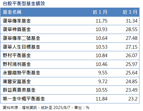 理柏資訊統計(截至2025/8/7),台股一般股票平衡型基金近1月平均漲幅達9.4%,近3月逾23%,表現優於加權報酬指數同期間的7.8%、19.3%,其中復華傳家、復華神盾、復華傳家二號、復華人生目標、野村鴻利、野村平衡、群益真善美、第一金中概平衡等8檔基金近1、3月漲幅皆有兩位數,表現相對突出。