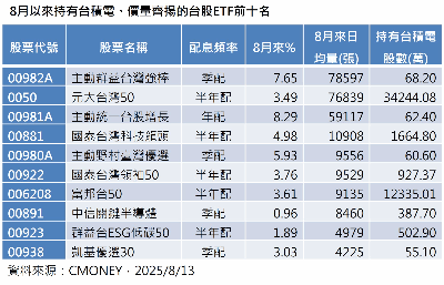 統計8月以來,20檔持有台積電50萬股以上的台股ETF績效與成交量表現,其中以績效來看,00982A 、00981A上漲約8%表現最佳,成交均量來看,則是00982A、0050日均量約8萬張最熱絡。市場法人表示,在晶片關稅不確定性消除及AI需求維持旺盛下,台股有望持續朝長期多頭軌道邁進,相關類股以及ETF表現可期,其中主動式ETF更值得投資人留意。