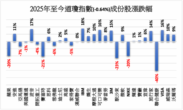 道瓊指數前5大權重股當中,高盛(權重8.81%)下跌0.23%,微軟(權重6.68%)上漲0.37%,家得寶(權重5.36%)收盤持平,Visa Inc.(權重5.28%)上漲0.77%,宣偉(權重5.18%)上漲0.86%。