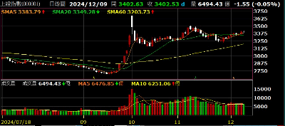 中國國家統計局今(9)日公布,今(2024)年11月CPI年增0.2%、遜於預期,以及PPI年減2.5%、優於預期。中國滬深兩市三大指數今日集體開低,惟隨後走勢有所分歧,在人形機器人板塊走跌,以及CRO概念股多數走高的交互影響下,滬指早盤震盪走揚,深證成指、創業板指則於平盤附近調整;臨近午盤,受到半導體板塊持續走低及地產股走弱拖累影響,各指數跌幅加劇、滬指亦翻黑。滬指終場險守3400點、收跌0.05%,終止連續二日走揚。