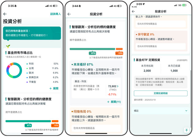 此功能利用更貼近市場即時動向的大數據,判斷未來市場的看漲信心與潛在的市場波動風險,「智」動化為客戶觀測每一筆投資標的,將客戶已有的投資部位轉化成三大投資策略,分為「市場信心轉強、波動下降的未來看好」、「市場信心轉強但波動同步增長的伺機布局」,及「市場信心轉弱建議觀望的保守觀望」,協助客戶隨時掌握資產健康度,做出更具行動力的投資決策,不再只是看著投資帳戶發呆!