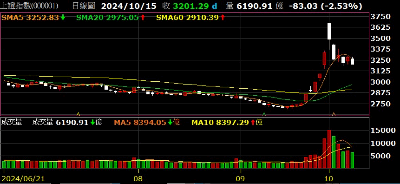 MoneyDJ新聞 2024-10-15 17:09:26 記者 新聞中心 報導 中國滬深兩市三大指數今(15)日集體開低,受到金融科技概念及中船系板塊下挫拖累,各大指數開低走低,深證成指、創業板指等盤中一度走揚翻紅,惟隨後市場追價意願不高,致整體盤勢再度翻轉下挫。滬指終場收跌2.53%、險守3200點。
