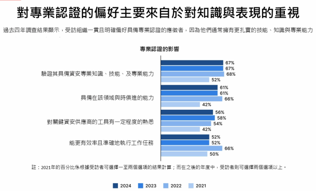 第三,近九成組織重視資安專業認證,重新定義適任人力。即使過去四年來,組織已在開發未被充分運用的人才庫方面取得一些進展,但他們仍表示,資安技能落差持續存在、且會因此降低其整體資安防護能力。而這樣的專業人才缺口,部分原因可能在於組織如何定義「適任人力」。