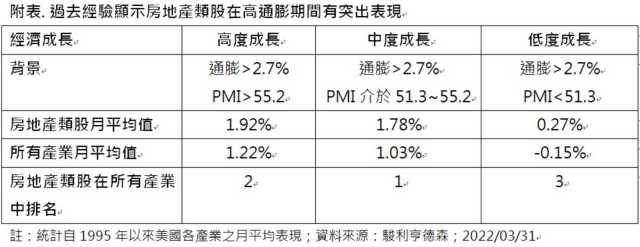 駿利亨德森遠見基金-全球地產股票基金經理人高博深(Tim Gibson)表示,自1995年以來,在高通膨時期,地產類股的表現在所有產業中均名列前茅,以接近目前環境、也就是經濟處於中度成長(PMI介於51.3~55.2之間)為例,房地產類股每月平均上漲1.78%,在所有產業中表現最佳;即使經濟轉入低度成長(PMI低於51.3),地產類股仍能有每月平均上漲0.27%的正成長,而所有產業的平均值則是-0.15%。由於租賃合約通常訂有固定漲幅或是隨著通膨調整,使得此產業的獲利不易受到通膨影響,因而反映在股價表現上。