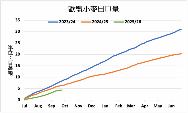 歐盟執委會9月30日公布,截至9月28日,7月起的2025/26年度,歐盟小麥出口量累計為4,371,580公噸,較上年同期的6,362,566公噸減少31%。大麥出口量累計為1,891,836公噸,較上年同期的1,532,980公噸增加23%。玉米出口量累計為120,296公噸,較上年同期的261,556公噸減少54%。