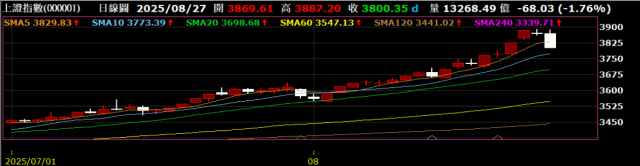 MoneyDJ新聞 2025-08-27 17:43:15 新聞中心 發佈 中國滬深兩市三大指數今(27)日早盤集體開高,早盤狹幅震盪走高;午後震盪下行、大幅跳水,滬指、深證成指均跌逾1%,創業板指午盤過後一度漲近3%,惟尾盤則呈跌勢加劇。滬指終場收跌1.76%,連續二日走跌,守住3800點大關。