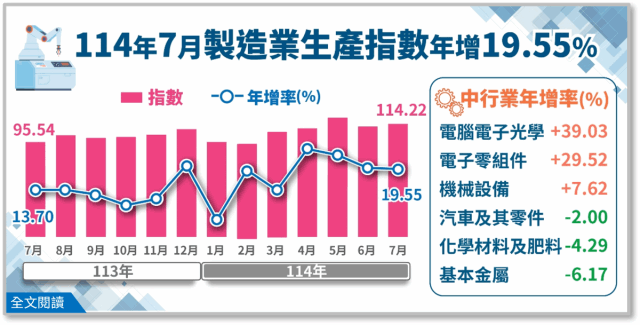 經濟部統計處今(26)日公布7月工業生產指數113.53,月增2.12%、年增18.11%;其中,製造業生產指數114.22,月增2.02%、年增19.55%(左圖),兩項指數均為連續第17個月正成長,並創歷年同月新高,主因人工智慧(AI)、高效能運算及雲端資料服務等應用需求續強,帶動資訊電子產業生產動能穩健提升,惟部分傳統產業因市場需求續疲,客戶保守觀望而續呈減產,抵銷部分增幅。累計今年1-7月工業生產指數106.74,年增16.85%;其中,製造業生產指數107.43,年增18.02%。