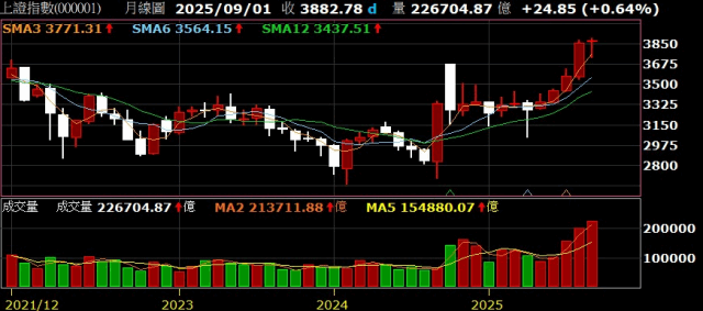 中國國家統計局上週六(9/27)公布8月工業企業利潤年增20.4%、終止連三月負成長,顯示利潤改善明顯;今(30)日公布9月製造業PMI升至49.8,略勝預期,加上官方表示將採適度寬鬆貨幣政策,為節前最後交易日帶來正面情緒。中國滬深兩市三大指數今集體開高,在有色金屬板塊強勢/江西銅業漲停、存儲晶片持續爆發、固態電池走強帶動下,滬指全日震盪走揚,終場收漲0.52%、連續2日走揚,日K連2紅、站穩5日線;本月漲0.64%(附圖)、月K連五紅;本季上漲12.14%、季K連二紅。
