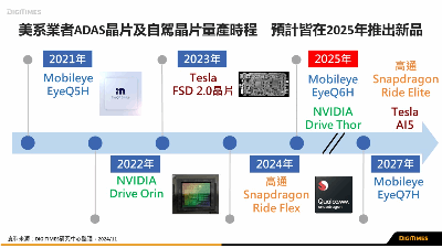DIGITIMES分析師余君濤表示,美系自駕晶片業者包括Mobileye、高通(Qualcomm)、NVIDIA與Tesla等,這些業者憑藉先進技術與成熟的產業鏈,在全球先進駕駛輔助系統(Advanced Driver Assistance Systems;ADAS)晶片與自駕晶片市場佔據重要地位。各大業者相繼推出高運算力的自駕晶片已成為推動自駕技術升級的關鍵要素,將強化AI功能,協助自駕車輛進行即時路徑規劃及預測道路使用者行為,進一步提升行車安全性。
