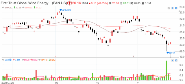 MoneyDJ iQuote報價顯示,追蹤風能股的「First Trust全球風力能源ETF」(First Trust Global Wind Energy ETF、代號FAN),24日上揚0.65%、收20.16美元。2021年迄今,FAN的最低收盤價為10月11日的19.88美元,近來FAN再次徘徊在今年低點附近。
