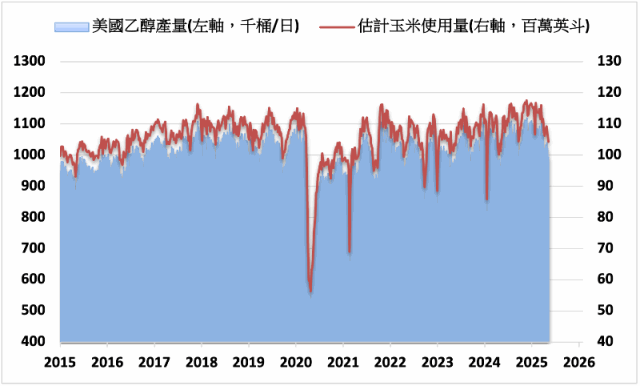 美國能源部月報預估今明兩年乙醇日均產量皆為105萬桶。從季度數據來看,預計今年第二季的燃料乙醇產量為每日103萬桶,第三季增至每日104萬桶,第四季則為每日105萬桶。進入2026年後,預計第一季為每日105萬桶,第二季為104萬桶,第三季為103萬桶,第四季則回升至106萬桶。