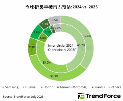 三星居於折疊機領先地位,近期推出新一代旗艦機Galaxy Z Fold7,在鉸鏈結構、摺痕控制與重量厚度等皆明顯優化。TrendForce表示,三星因面臨其他品牌競爭,折疊龍頭地位將受挑戰,預估其全球市占率將從2024年的45.2%下降至2025年35.4%。