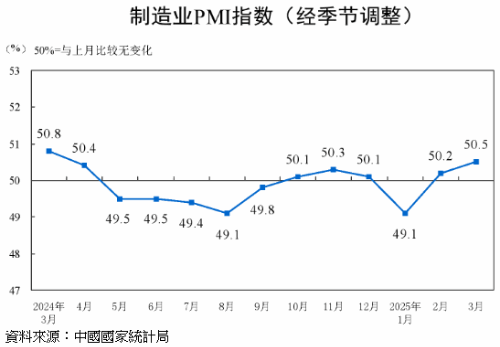 中國國家統計局今(31)日公布,今(2025)年3月製造業採購經理指數(PMI)為50.5%,較上月上升0.3個百分點,連兩月上升,略高於市場預期的50.4%,製造業景氣水準繼續回升。