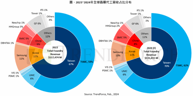 MoneyDJ新聞 2024-02-23 16:36:11 記者 新聞中心 報導 根據集邦科技(TrendForce)研究顯示,2023年全球晶圓代工營收約1,174.7億美元,台積電(2330)營收占比約60%;2024年全球晶圓代工營收預估約1,316.5億美元,台積電占比將再向上升至62%。除了營收占比居冠,台積電目前選定美國、日本與德國分別為先進、成熟工廠的據點,又以日本進度最快,完工時程甚至提前。明(24)日即將迎來台積電熊本廠(JASM)正式開幕,也是台積電在日本的第一座工廠(Fab23),TrendForce表示,未來總產能將達40~50Kwpm規模,其製程將以22/28nm為主,還有少量的12/16nm,為後續的熊本二廠主力製程作準備。