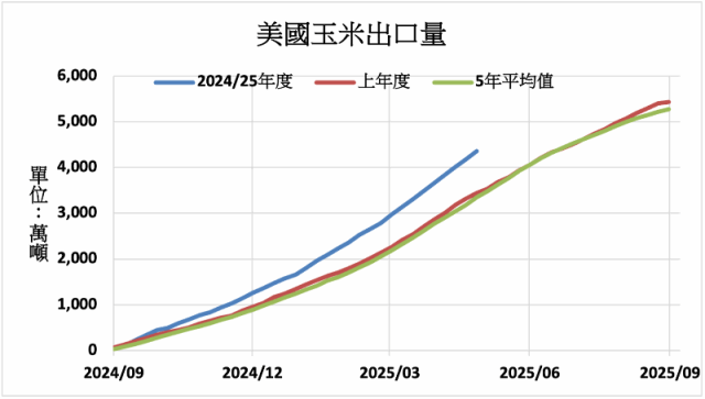 玉米當週出口裝船量為1,819,500公噸,較前一週增加14%,較前四週平均增加5%。出口的主要目的地為墨西哥(668,500公噸)、日本(396,800公噸)、哥倫比亞(190,000公噸)、台灣(158,600公噸)、以及南韓(134,800公噸)。2024/25年度至今,美國玉米出口量年增27%至4,360萬噸。美國農業部4月報告將2024/25年度美國玉米出口量較前月上調254萬噸,預估將年增11%至6,477萬噸。