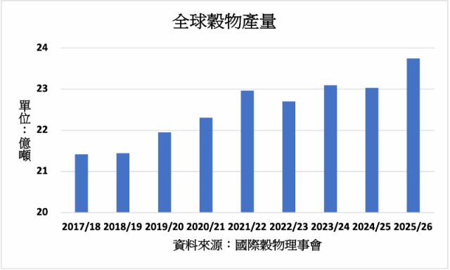 2025/26年度全球小麥產量預估將年增700萬噸至8.06億噸,與前月的預估相同;小麥消費量預估將年增900萬噸至8.13億噸。玉米產量預估將年增5,400萬噸至12.77億噸,較前月預估上調300萬噸;玉米消費量預估將年增2,600萬噸至12.68億噸,較前月預估下調100萬噸。