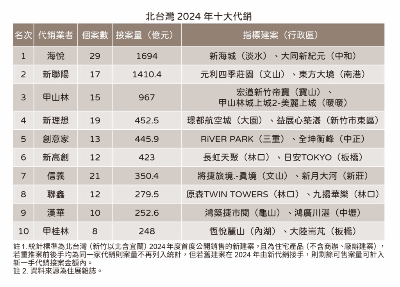 住展雜誌統計排行北台灣去(2024)年十大代銷在住宅產品接案狀況(不含商辦、廠辦建案),依接案量統計依序為海悅(2348)、新聯陽、甲山林、新理想、創意家、新高創、信義代銷、聯鑫、漢華、甲桂林,接案量介於248至1694億元,2024年總接案量來到6523.3億元,相比2023年增27.2%。